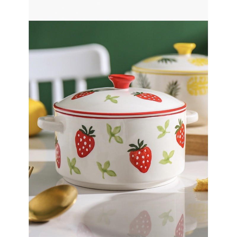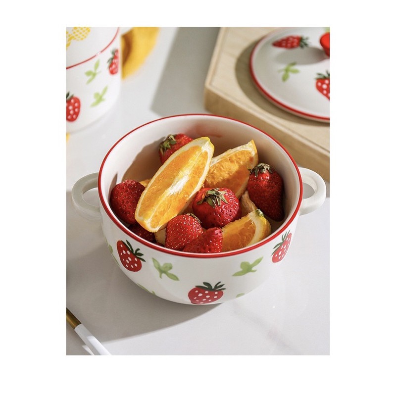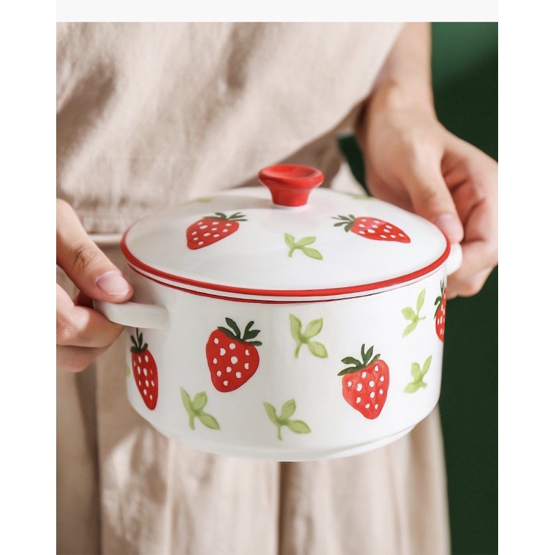 Nhà cửa & Đời sống > Bộ đồ bàn ăn > Tô || Tô sứ có nắp hình dâu tây đỏ kiểu Bắc ÂuCòn hàng