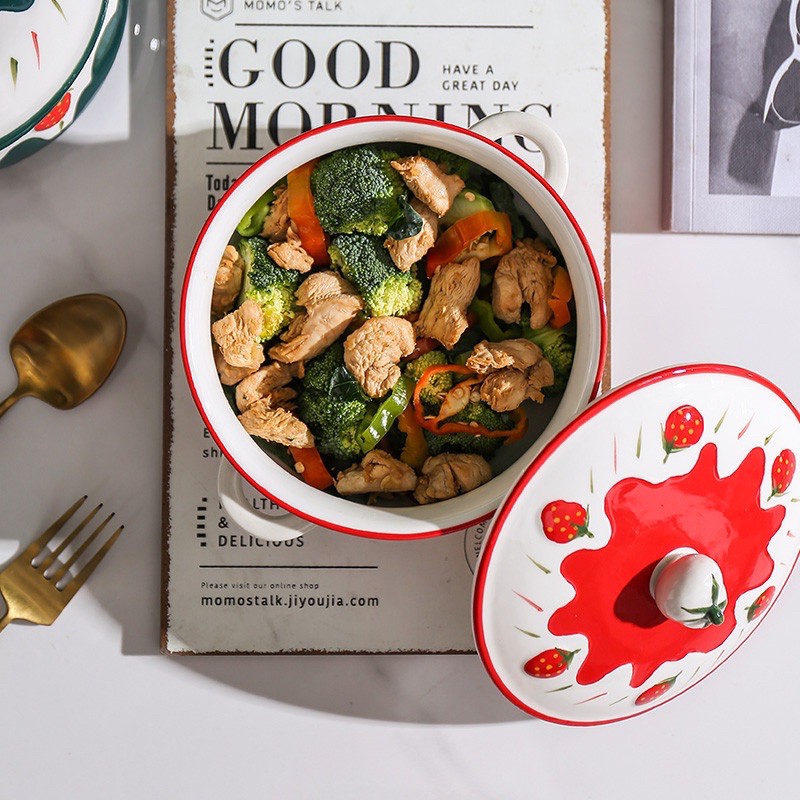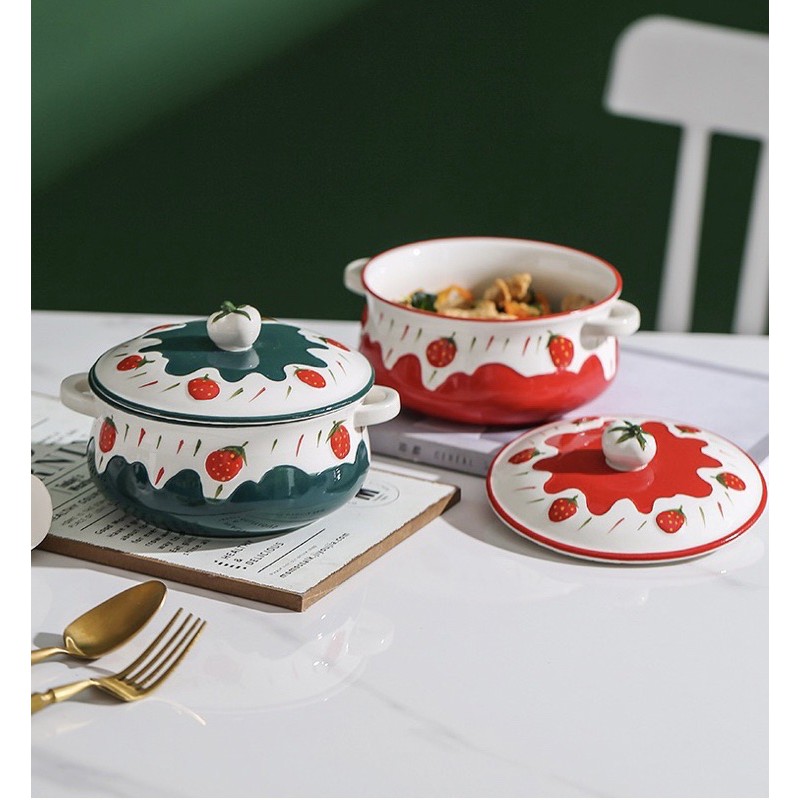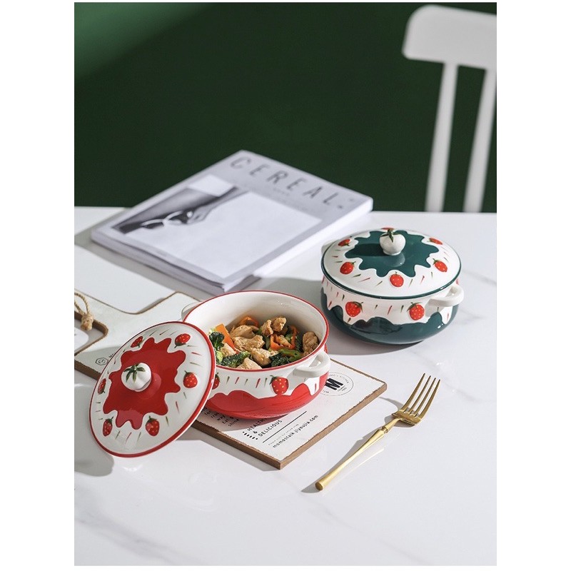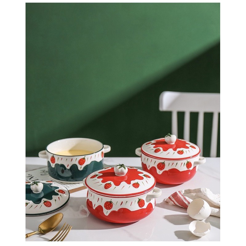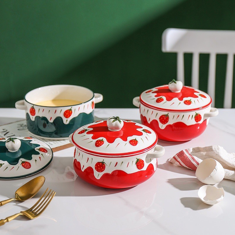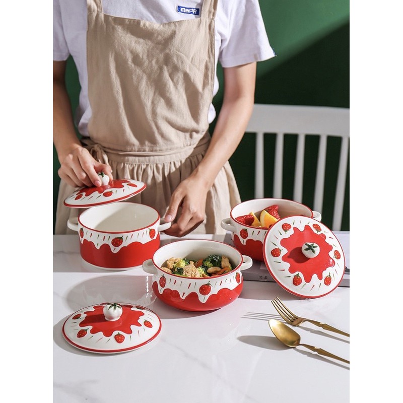 Nhà cửa & Đời sống > Bộ đồ bàn ăn > Tô || Tô sứ có nắp, tô đựng cơm, ăn mì dâu tây 3D kiểu Bắc ÂuCòn hàng