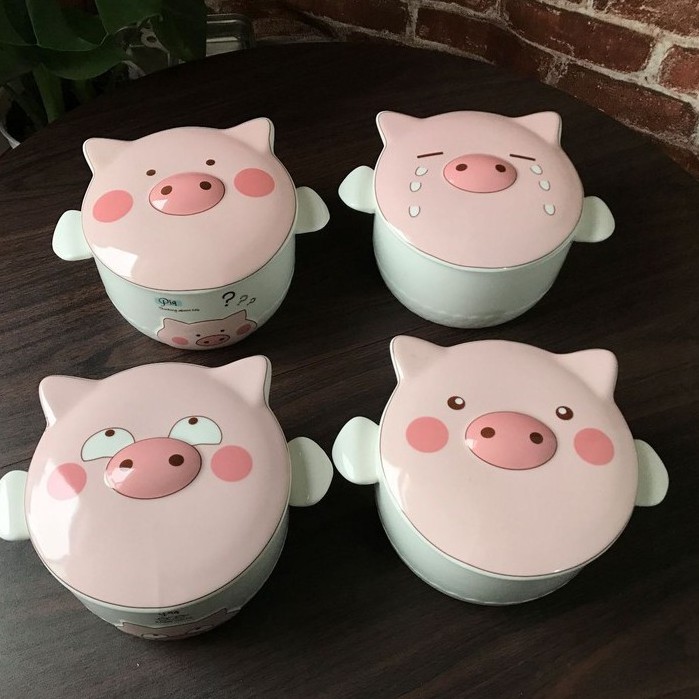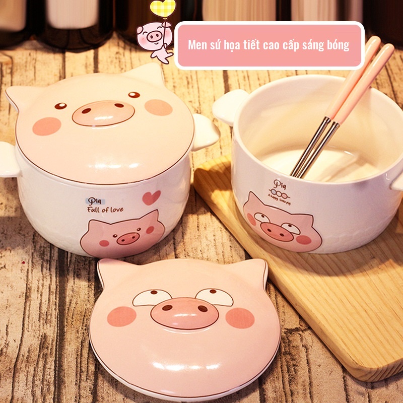 Tô sứ hình con heo Tô ăn mì Tô sứ có nắp có tai cầm hoạ tiết heo dễ thương dùng được trong lò vi sóng
