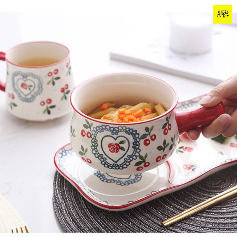- Sản phẩm: Tô sứ, tô sứ có tay cầm kèm khay sứ họa tiết Cherry - dùng đựng soup, salad, đồ ăn sáng