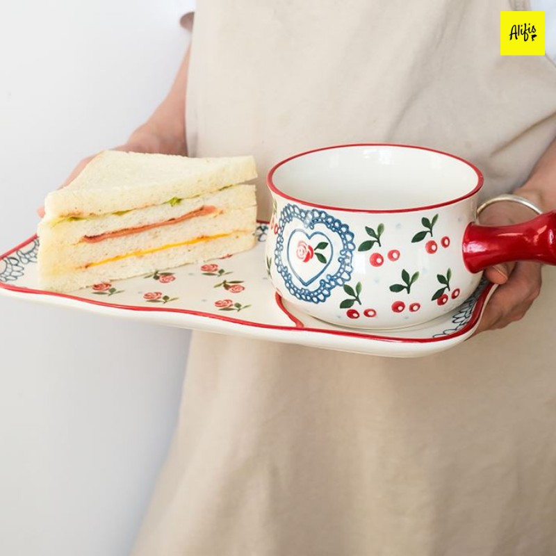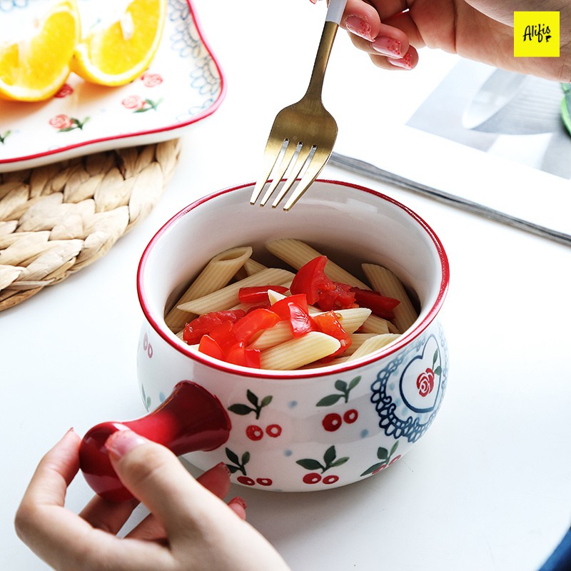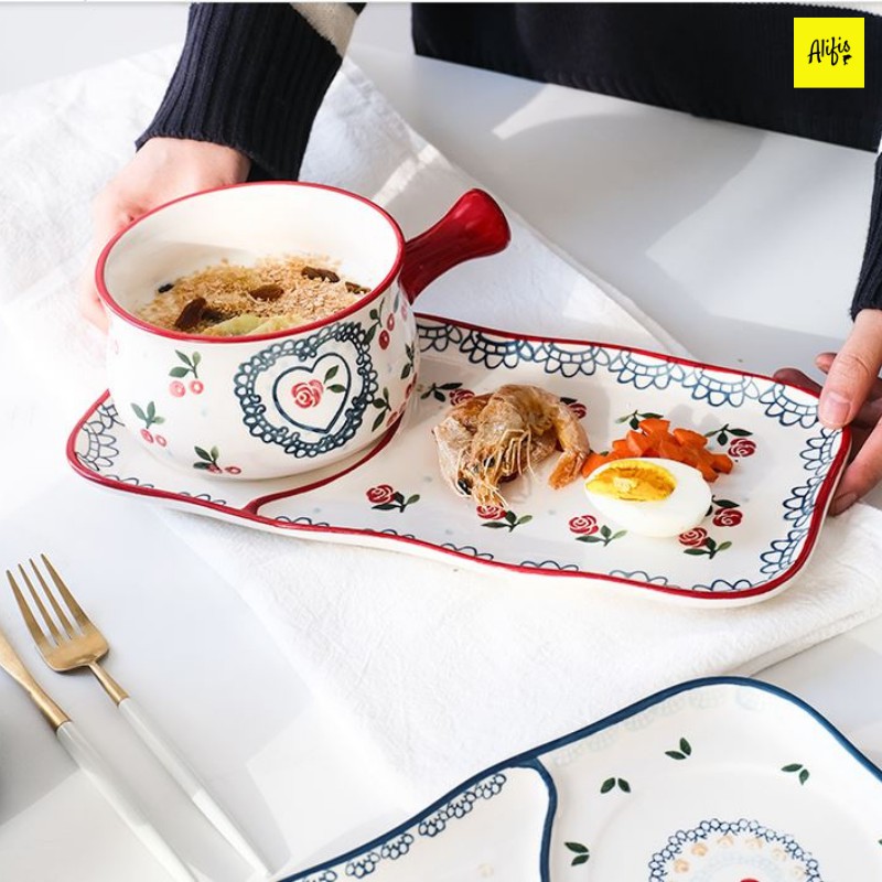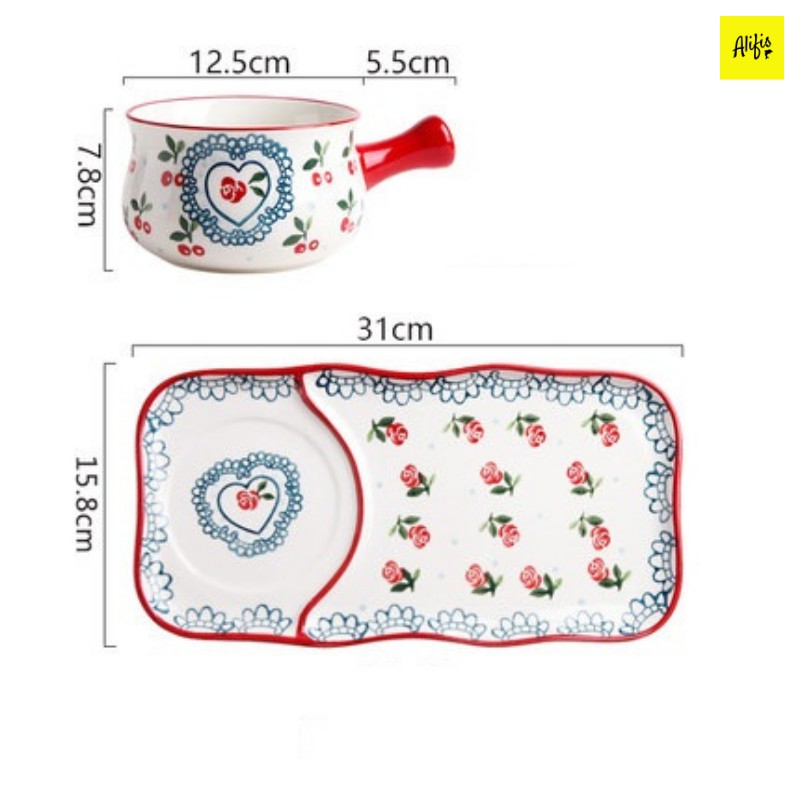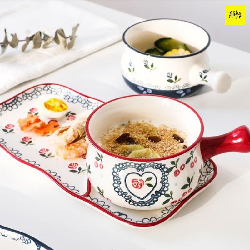 Set 2 món gồm tô sứ có tay cầm và khay sứ nhiều họa tiết đựng soup, salad, đồ ăn sáng tiện lợi Alifis
