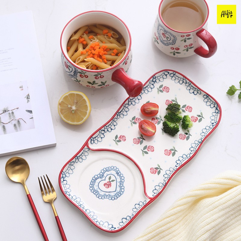 Nhà cửa & Đời sống > Bộ đồ bàn ăn > Dĩa || Tô sứ, tô sứ có tay cầm kèm khay sứ họa tiết Cherry - dùng đựng soup, salad, đồ ăn sángCòn hàng