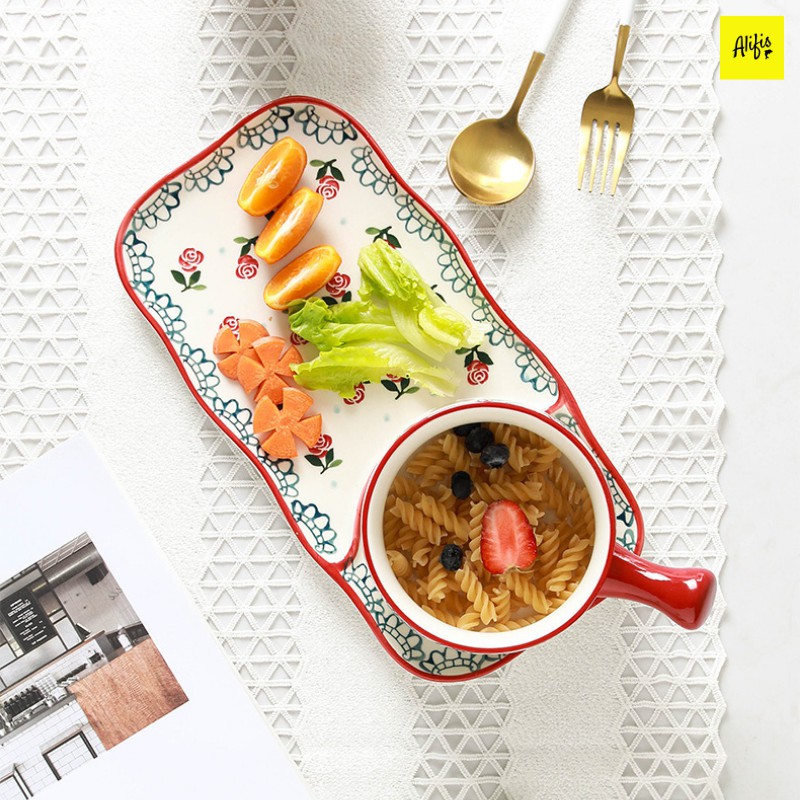 Giới thiệu Set 2 món gồm tô sứ có tay cầm và khay sứ nhiều họa tiết đựng soup, salad, đồ ăn sáng tiện lợi Alifis