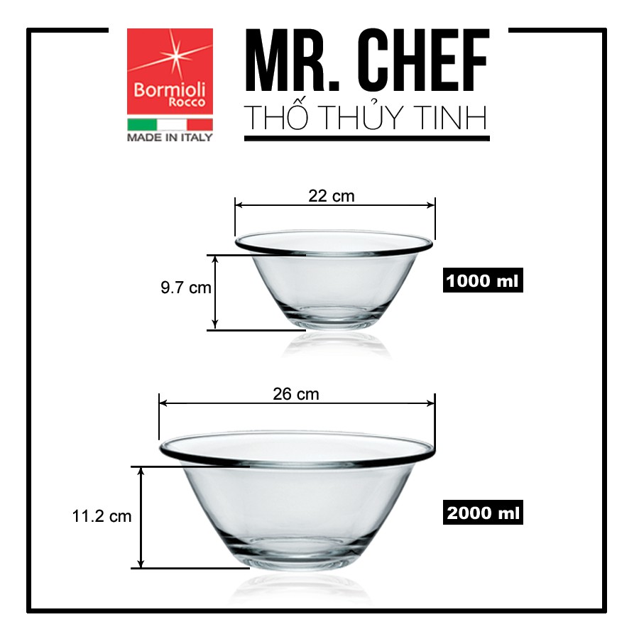* Tư vấn của shop mình: Đây là tô thủy tinh chính hãng từ thương hiệu Mr Chef (Thương hiệu con của Bormioli Rocco từ Ý), sản phẩm được sản xuất tại nhà máy ở Ý, chất lượng thủy tinh trong suốt và dày dặn hơn nhiều (4mm) so với các loại tô thủy tinh trên thị trường, đặc biệt khả năng chịu sốc nhiệt vô cùng tốt, sản phẩm an toàn khi sử dụng trong lò vi sóng!CHI TIẾT:
