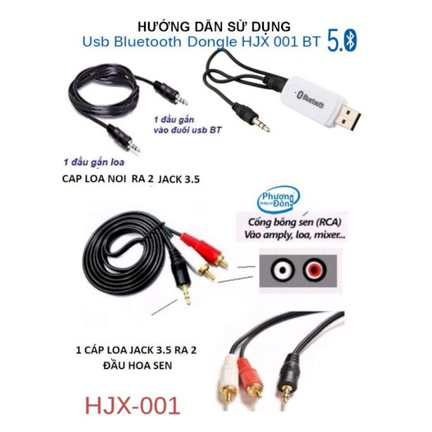 👉 Đối với thiết bị không có cổng USB (amply thông thường, lọc xì equalizer, mixer, vang, nâng tiếng, loa vi tính,...): phải sử dụng thêm 1 cáp tương thích cho thiết bị chuyền âm thanh vào thiết bị của bạn (ví dụ dây 3.5ly ra 2 bông sen dùng kết nối nào amply, mixer, equalizer; dây 2 đầu 3.5 dùng kết nối loa thường) - 1 đầu 3.5mm cắm vào USB bluetooth, đầu còn lại cắm vào thiết bị --> Cắm USB bluetooth vào nguồn điện 5v (cục sạc điện thoại) --> Đèn màu xanh sáng là USB đã nhận --> Dò Bluetooth với tên BT-DONGLE --> Kết nối và thưởng thức âm nhạc.