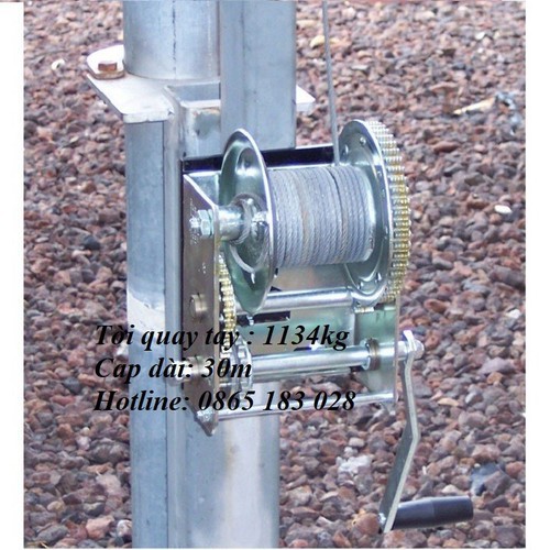 tời , tời quay tayLà thiết bị được lựa chọn nhiều trong việc nâng hạ hàng hóa ở vị trí chật hẹp, thay cho việc dùng palang xích kéo tay. Tời được dùng bằng tay thông qua "tay quay" trên thân tời làm quay cơ cấu chuyển động để thực hiện việc quay tang tời, quấn hoặc nhả cáp theo ý muốn. - Tời cáp quay tay sử dụng để: nâng hạ tải, kéo tải, kéo căng, tời tải... - Tải trọng của tời: 600LBS, 800LBS, 1000LBS, 1200LBS, 1400LBS, 1600LBS, 2000LBS, 2500LBS, 3000LBS (Ghi chú : 1 LB = 0.454 kg) - Tải trọng tính theo kg: 272 kg, 363 kg, 454 kg, 544, 635, 726 kg, 908 kg, 1135, 1360Kg
