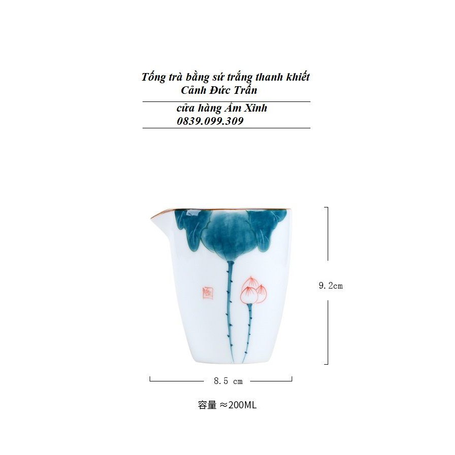 Tống Chuyên trà bằng sứ trắng thanh khiết Cảnh Đức Trấn 200 ml+ Kích thước & Dung tích: Rộng * Cao = 8.5 cm *9.2 cm (Đường kính miệng tống 7.3 cm) Dung tích 200 ml.