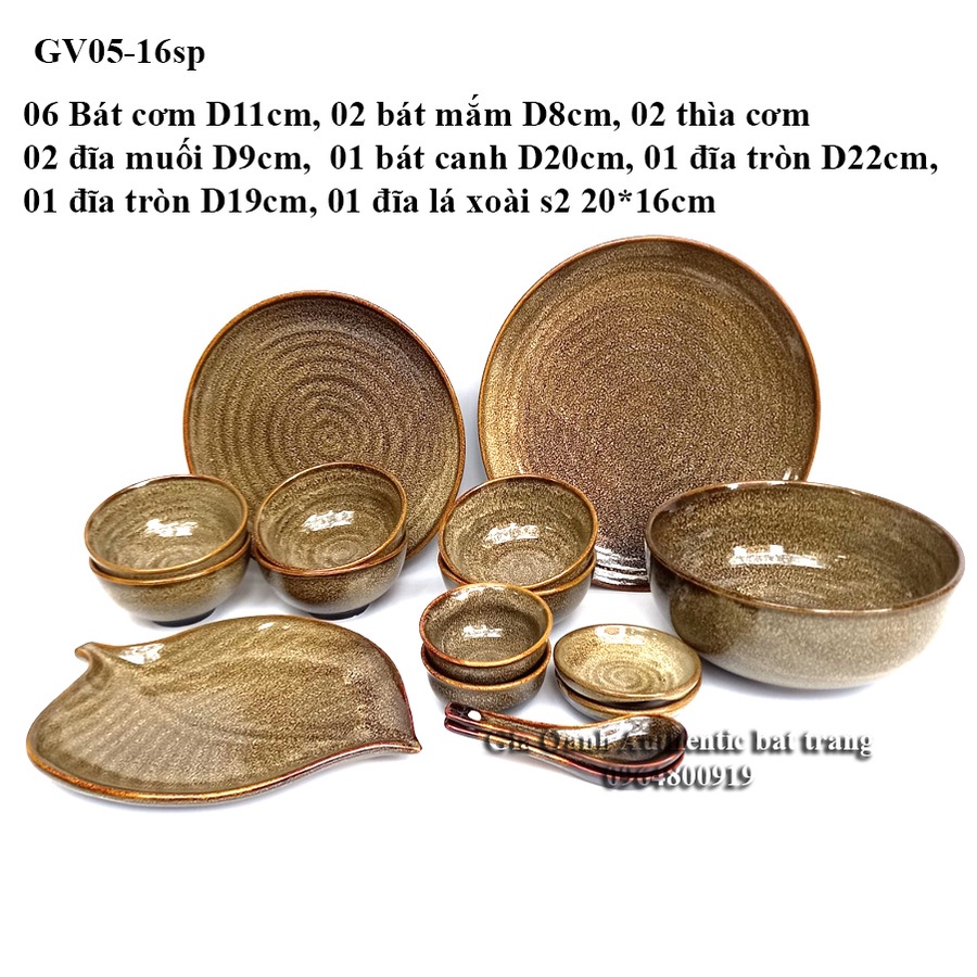 Sản phẩm bộ đồ ăn gấm vàng hỏa biến sản xuất tại xưởng gốm sứ Gia Oanh Authentic Bat trang bao gồm nhiều phân loại phù hợp cho quý khách hàng lựa chọn, gồm bát ăn cơm, thìa cơm chén mắm, đĩa muối, đĩa ăn tròn các kích thước khách nhau từ d15-d30cm, đĩa lá xoài, đĩa lá bỏng, khay nan, đĩa vuông, bát tô, âu cơm....