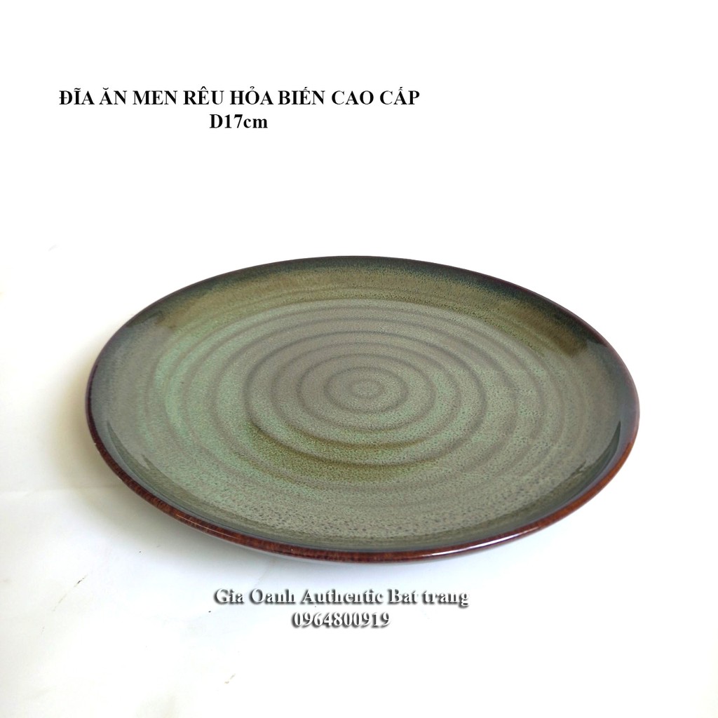 Đĩa ăn men rêu hỏa biến, chuyên dùng cho nhà hàng khách sạn cao cấp, với dòng men dày, sang trọng, đẹp dòng men được nung ở nhiệt độ rất cao 1300 độ C, đảm bảo đẹp, bền chắc và rất sang trọng, Để trong lò vi sóng, máy rửa chén bát đều rất an toàn,Đặc biệt sản phẩm đĩa ăn men rêu hỏa biến của gia oanh authentic bat trang không chữa chì và kim loại nặng