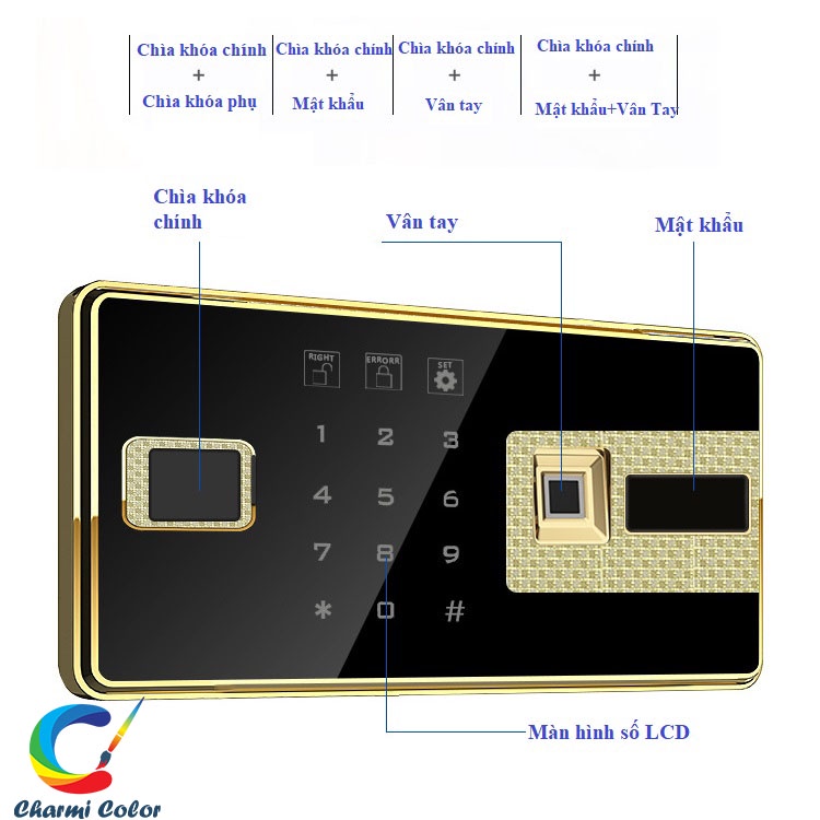• Khóa điện tử có thể đặt mật mã từ 3 đến 8 số hay vân tay
