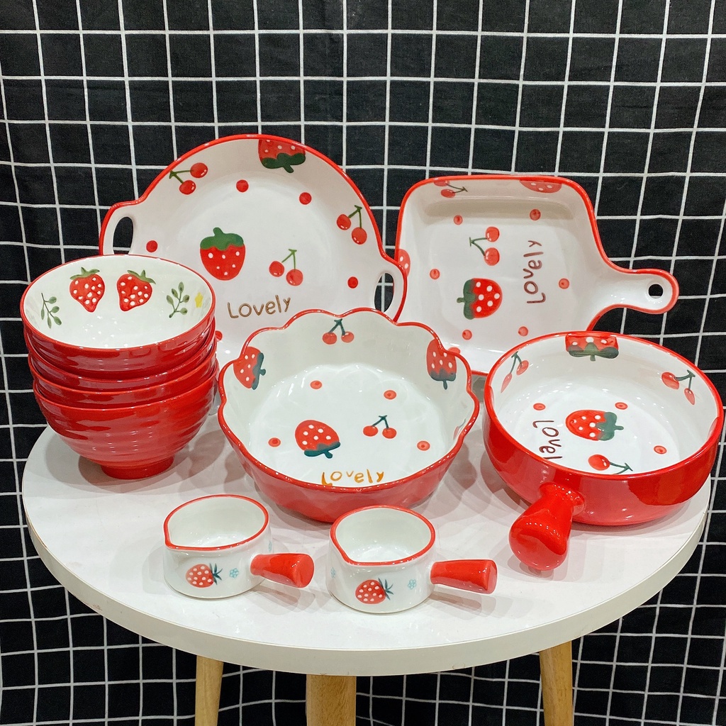 [Tổng hợp ]Set Bát Đĩa Dâu Đỏ Bát Ăn Cơm Ăn Mì Chén Dĩa Decor Dễ Thương
