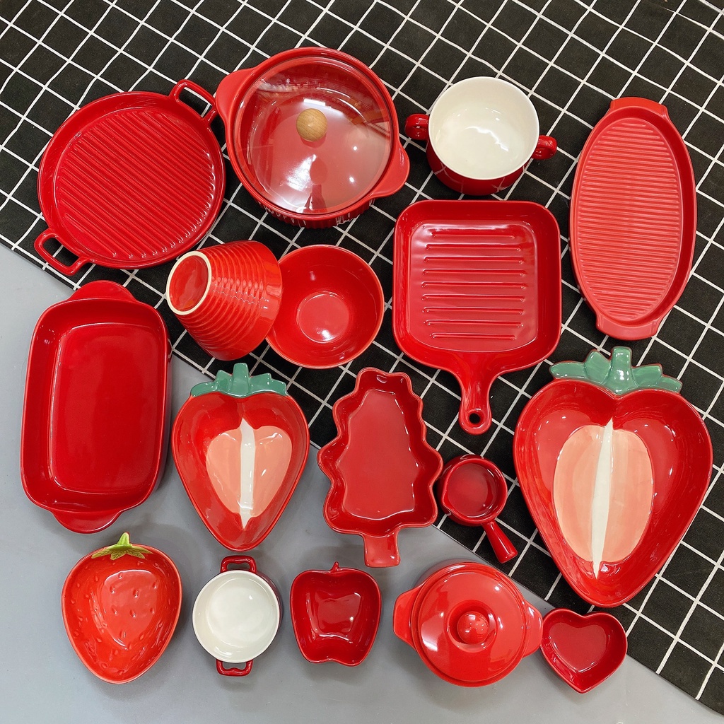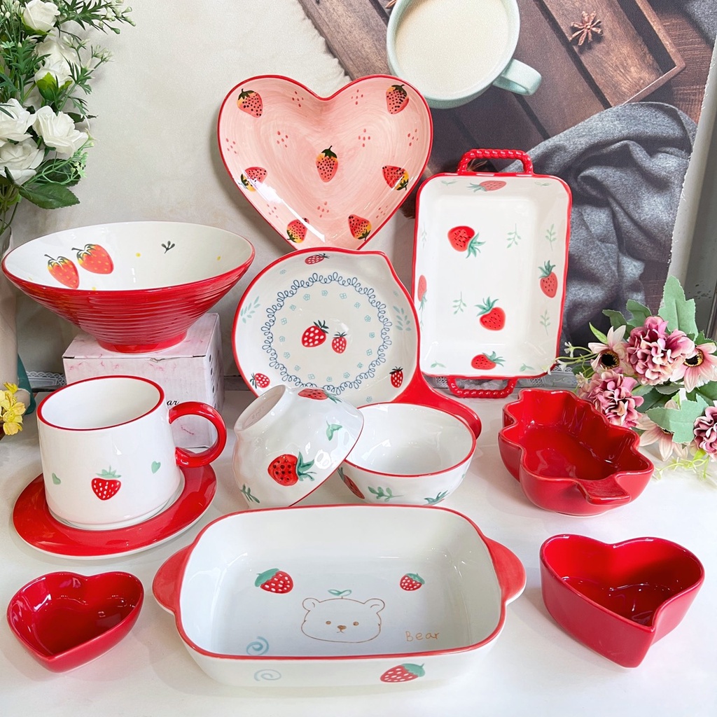Nhà cửa & Đời sống > Bộ đồ bàn ăn > Dĩa || [Tổng hợp ]Set Bát Đĩa Dâu Đỏ Bát Ăn Cơm Ăn Mì Chén Dĩa Decor Dễ ThươngCòn hàng