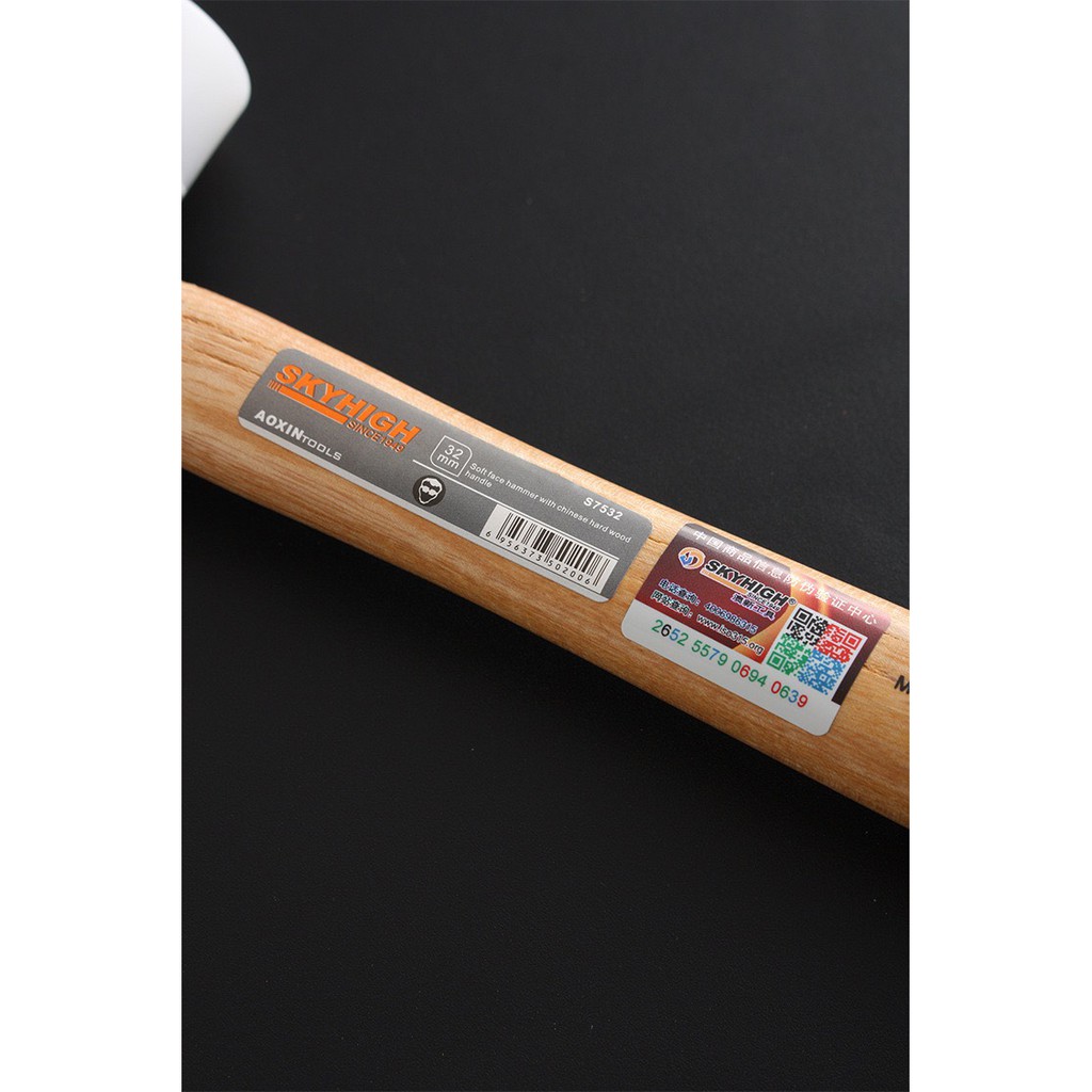 Tay cầm bằng gỗ là gỗ óc chó, thân búa làm từ gang đen và cao su trắng ở hai đầu.