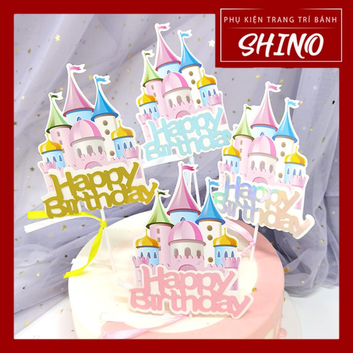 Giới thiệu Topper/Que cắm giấy/mica hình lâu đài trang trí bánh chữ HPBD