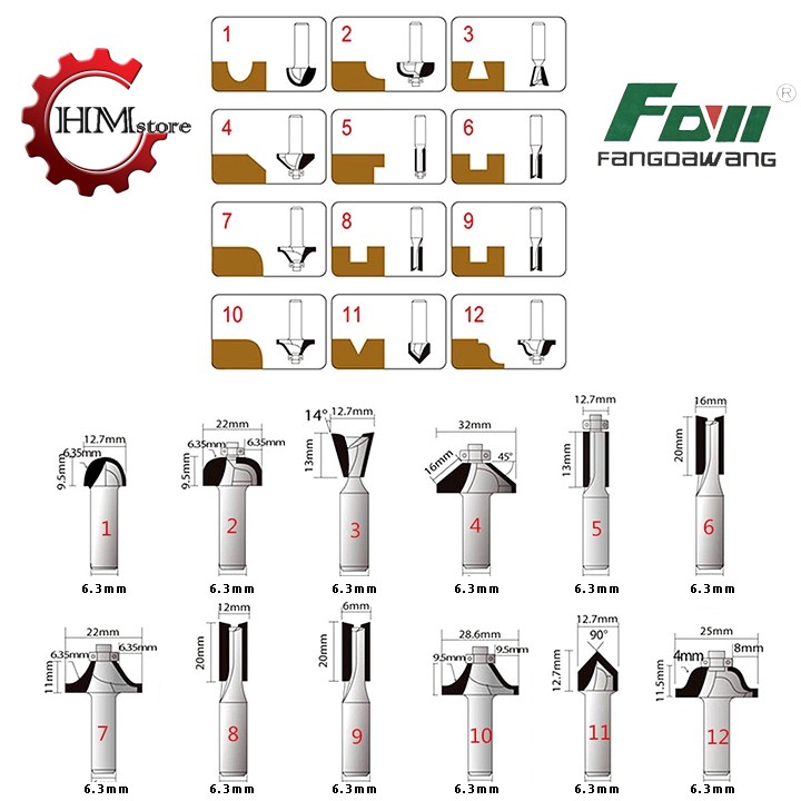 Nhà cửa & Đời sống > Dụng cụ & Thiết bị tiện ích > Dụng cụ > Cưa, máy cắt & máy mài || Loại tốt - Bộ mũi phay Favi - Bộ mũi phay gỗ 12 món cốt 6.35mm chuyên dùng cho các máy soi gỗ cầm tay thương hiệu FAVICòn hàng