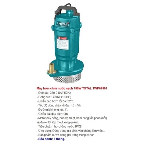 Nhà cửa & Đời sống > Dụng cụ & Thiết bị tiện ích > Máy bơm nước & phụ kiện || TOTAL Máy bơm chìm nước sạch 0.5HP TWP63701 (Cam kết Chính Hãng 100%)Còn hàng
