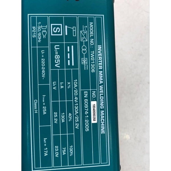 Điện thế: 220-240 V; Tần số: 50-60 Hz, 1 pha; Điện thế không tải: 85 V; Điện áp ra: 10-130A; Điện áp ra tối đa: 130A; Hiệu suất: 60%; Kích thước que hàn: 1.6 -3.2 mm; Kèm 1 kèm hàn, kèm Max, 1 cây chổi và 1 mặt nạ hàn; TL: 4kg