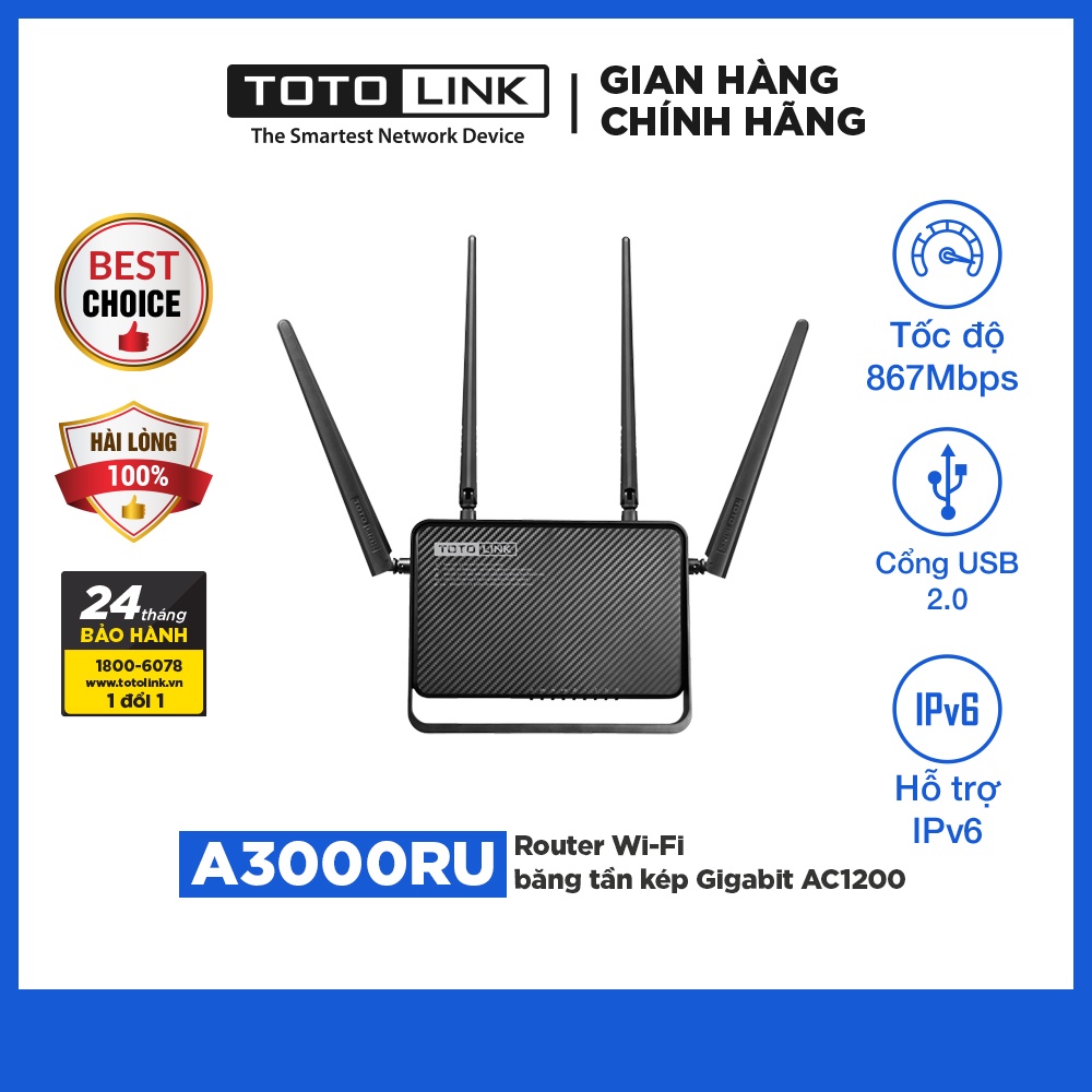 TOTOLINK A3000RU - Router Wi-Fi băng tần kép Gigabit Chuẩn AC 1200Mbps Cục phát wifi - Hãng phân phối chính thức