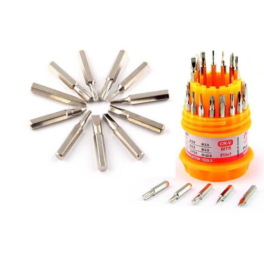 - Bộ sản phẩm gồm 31 đầu vít với đầy đủ các dạng đầu và kích cỡ: dẹt, tam giác, lục giác, hay các đầu từ 3 đến 6 cạnh............
