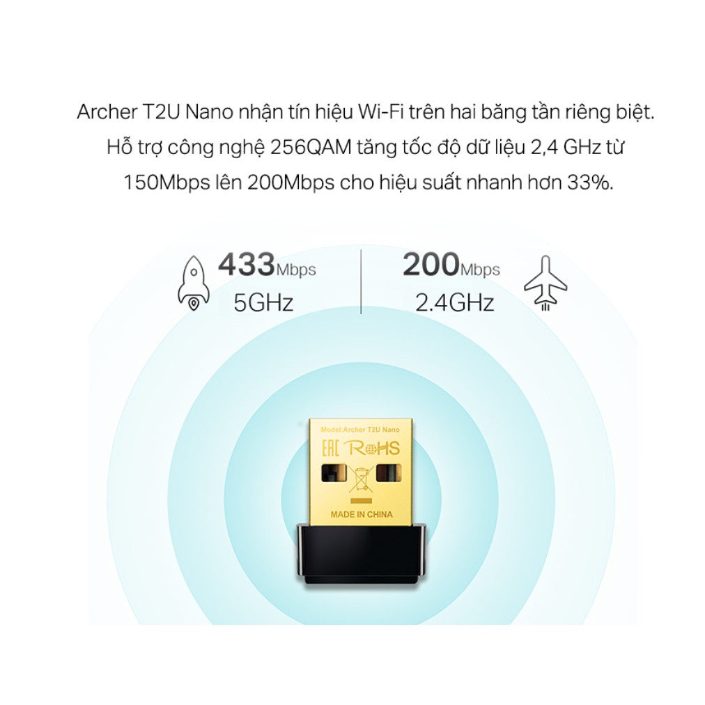 Archer T2U Nano nhận tín hiệu Wi-Fi trên hai băng tần riêng biệt. Hỗ trợ công nghệ 256QAM tăng tốc độ dữ liệu 2,4 GHz từ 150Mbps lên 200Mbps cho hiệu suất nhanh hơn 33%. Tốc độ 433Mbps trên 5GHz lý tưởng cho truyền phát video HD và chơi game online không bị lag, đồng thời tốc độ 200Mbps trên 2.4GHz hoàn hảo để lướt web với các thiết bị cũ.