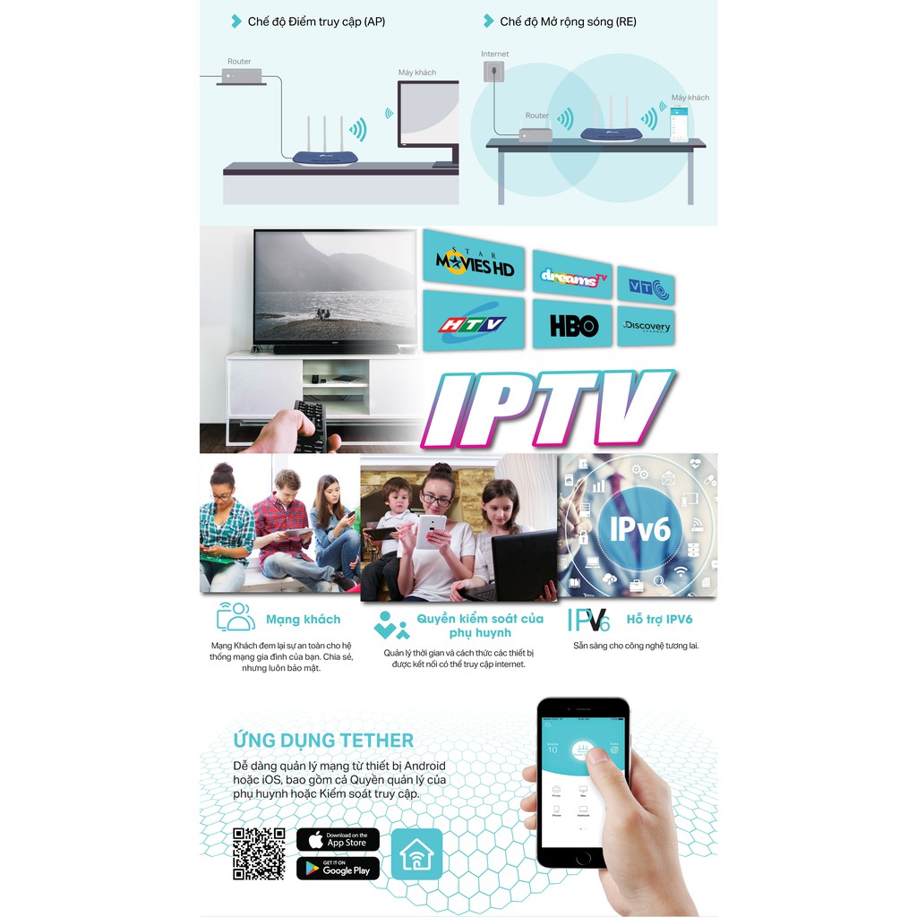 Ngoài ra,thiết bị còn hỗ trợ IPTV, IGMP Proxy/Snooping, Bridge và Tag VLAN để tối ưu hóa luồng IPTV tương thích với IPv6 (Internet Protocol version 6)