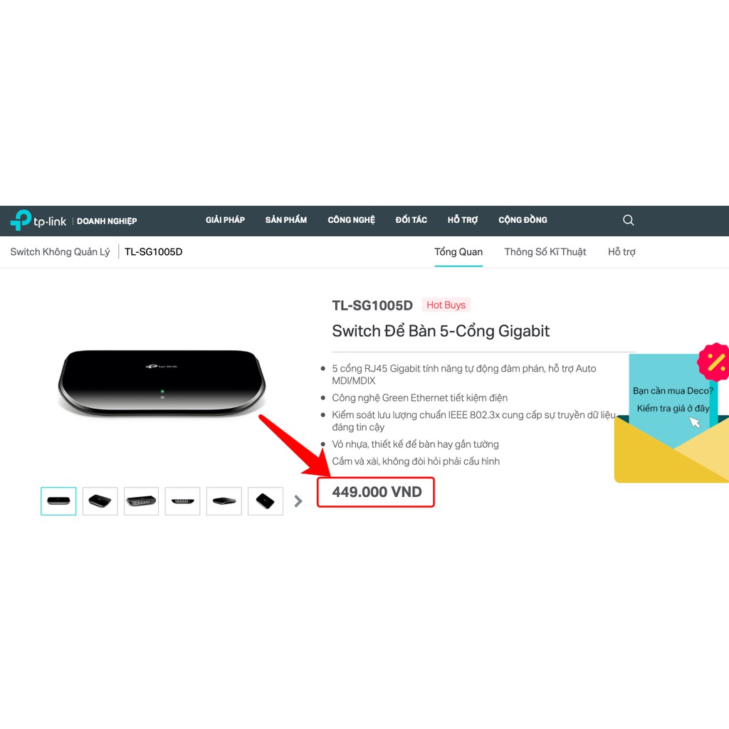 Máy tính & Laptop > Thiết Bị Mạng > Bộ chia mạng || [Mã 253ELSALE hoàn 7% đơn 300K] TP-Link Bộ chi tín hiệu mạng 5 cổng gigabit - TL-SG1005D - Hàng Chính HãngCòn hàng