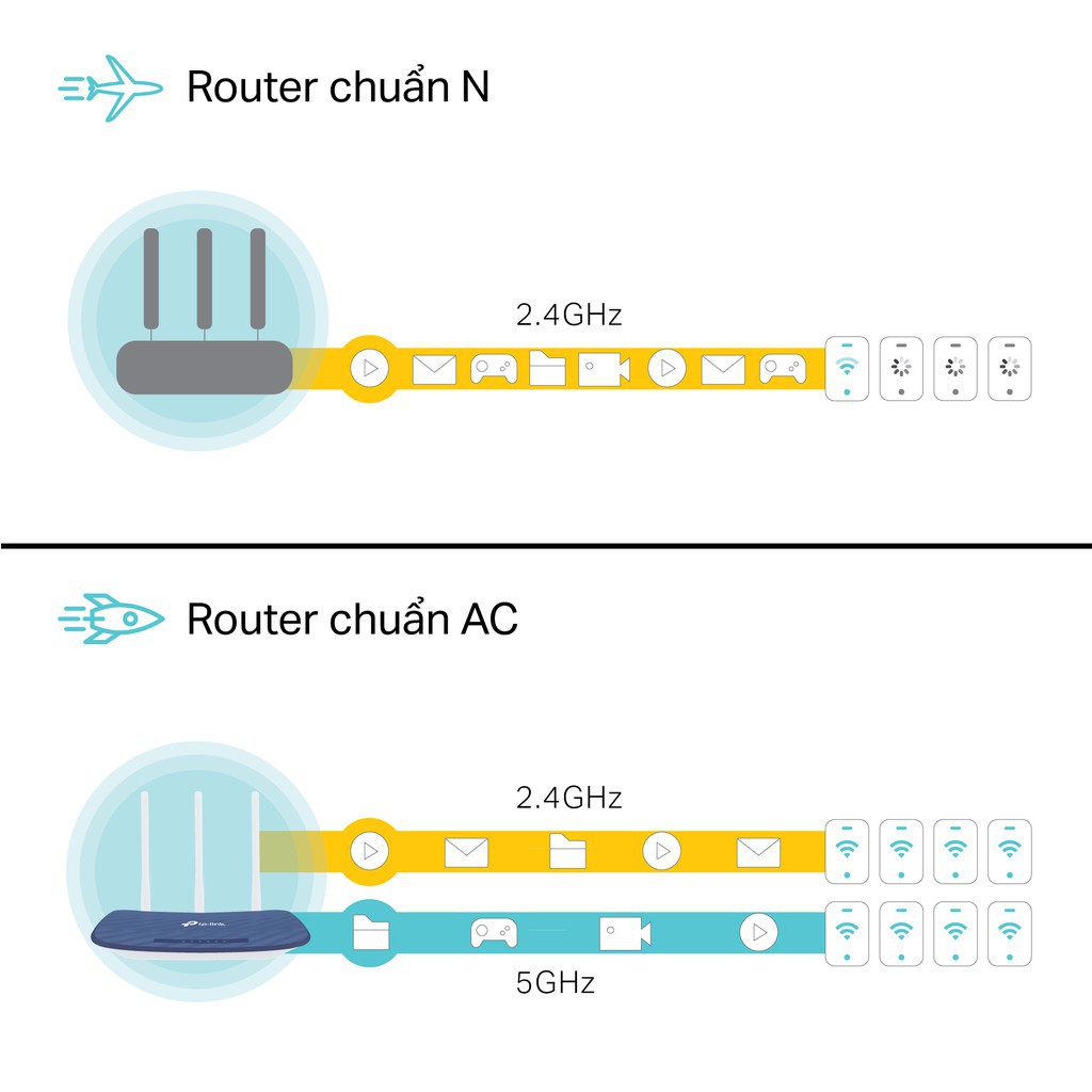 - Kết nối băng tần kép tốc độ 750Mbps: Với 2 băng tần 5GHz và 2.4GHz, Archer C20 cung cấp sự linh hoạt và đảm bảo hiệu suất wifi tuyệt vời. Các tác vụ đơn giản như gửi e-mail hoặc duyệt web có thể được xử lý bởi băng tần 2.4GHz, trong khi các tác vụ tiêu tốn nhiều băng thông như chơi game online, hoặc phát video HD có thể được xử lý bởi băng tần 5GHz.