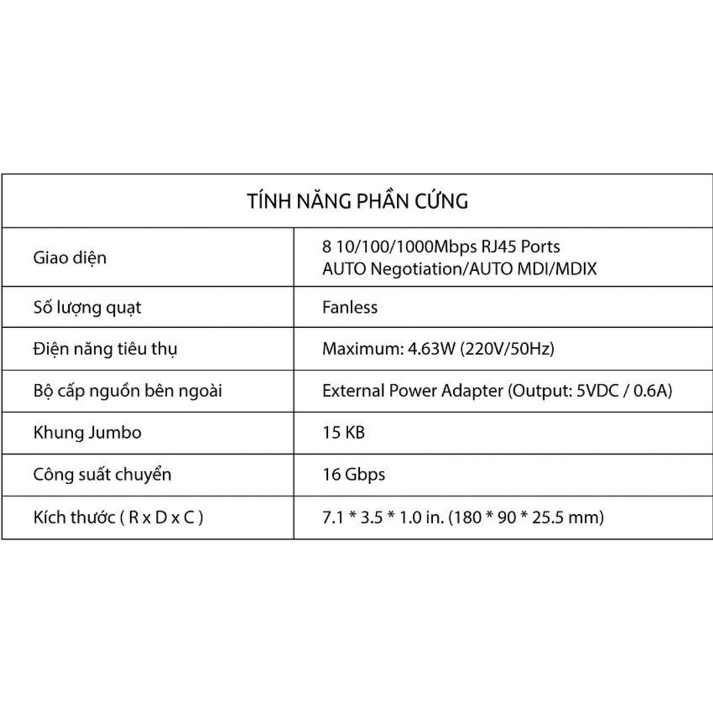 8 cổng RJ45 Gigabit Auto-Negotiation, hỗ trợ MDI/MDIX tự độngCông nghệ Ethernet thân thiện với môi trường tiết kiệm năng lượng đến 80%