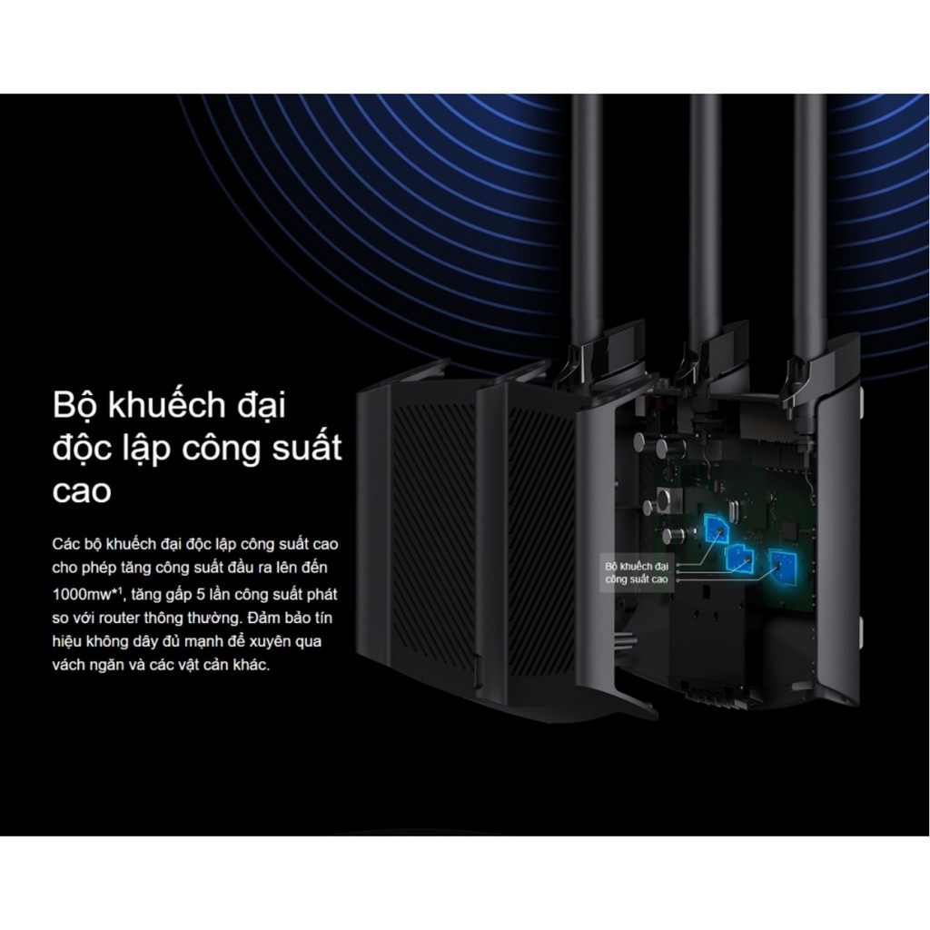 Các bộ khuếch đại độc lập công suất cao cho phép tăng công suất đầu ra lên đến 1000mw*1, tăng gấp 5 lần công suất phát so với router thông thường. Đảm bảo tín hiệu không dây đủ mạnh để xuyên qua vách ngăn và các vật cản khác.
