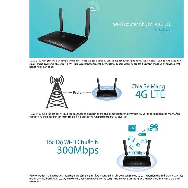 TP-LINK TL-MR6400 Router Wifi dùng sim 3G 4G phát wifi tốc độ 150Mb hỗ trợ 4 cổng Lan- Hàng Chính Hãng Tp-Link❈ GIỚI THIỆU TÍNH NĂNG SẢN PHẨM ❈