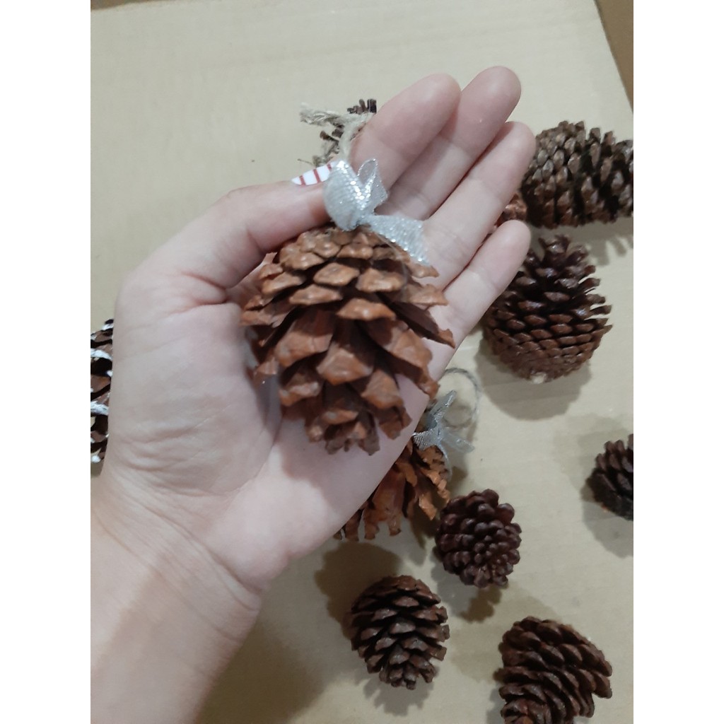 6-7cm trái thông màu sắc tự nhiên có nơ và cuốn treo