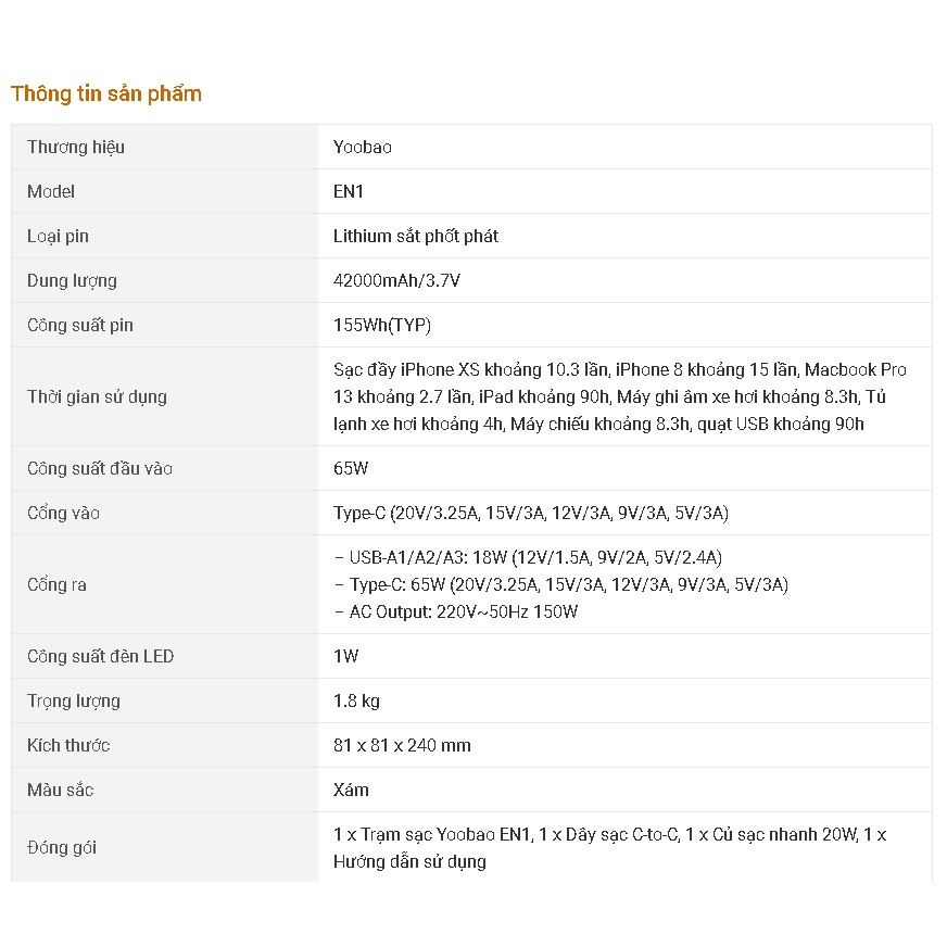 Điện Thoại & Phụ Kiện > Phụ kiện > Sạc dự phòng & Pin > Sạc dự phòng || Trạm Sạc Điện Yoobao EN1 42000MAh, Sạc Nhanh Hai Chiều PD65W, Biến Tần Công Suất Lớn 220v, Có Đèn LED Sử Dụng Ngoài TrờiCòn hàng