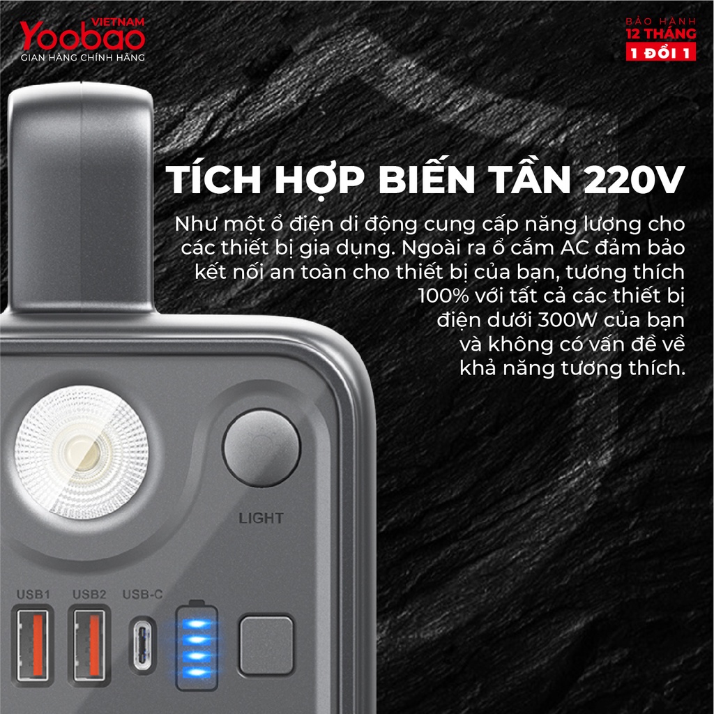 - Tích hợp biến tần 220V: Yoobao EN300WWLPD như một ổ điện di động cung cấp năng lượng cho các thiết bị gia dụng. Ngoài ra ổ cắm AC đảm bảo kết nối an toàn cho thiết bị của bạn, tương thích 100% với tất cả các thiết bị điện dưới 300W của bạn và không có vấn đề về khả năng tương thích.