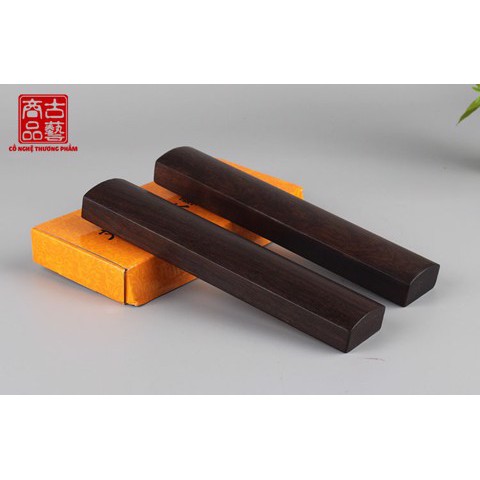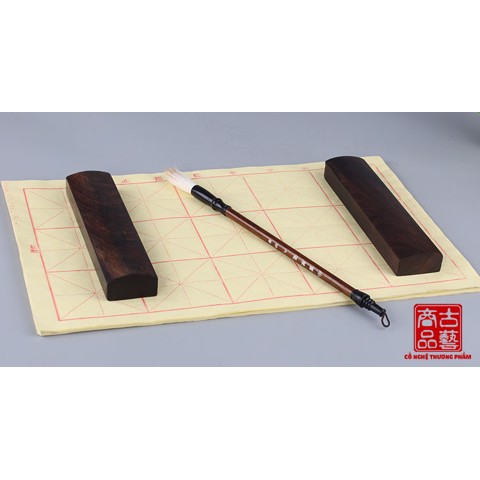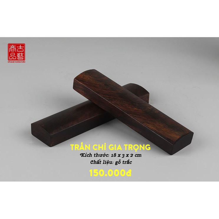 Khi viết thư pháp, để giấy được căng ta cần một dụng cụ chuyên dụng để chặn giấy. Thước chặn giấy (còn gọi là Trấn chỉ) đáp ứng nhu cầu này của chúng ta.Thước chặn giấy Gia Trọng làm hoàn toàn từ gỗ trắc, được xử lý chống mối mọt và làm nhẵn bề mặt nên rất thích hợp để chặn trên tất cả các loại giấy, vải. Ngoài công dụng chặn giấy, thước có độ dài một gang tay (18cm) đủ để làm một cây thước thông thường. Màu gỗ thẫm nên bạn cũng có thể dùng thước đẻ gác bút.