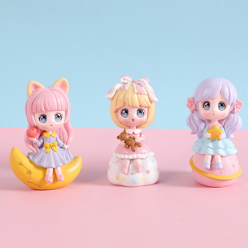 Trang trí bé gái tóc hồng ngồi trên mặt trăng