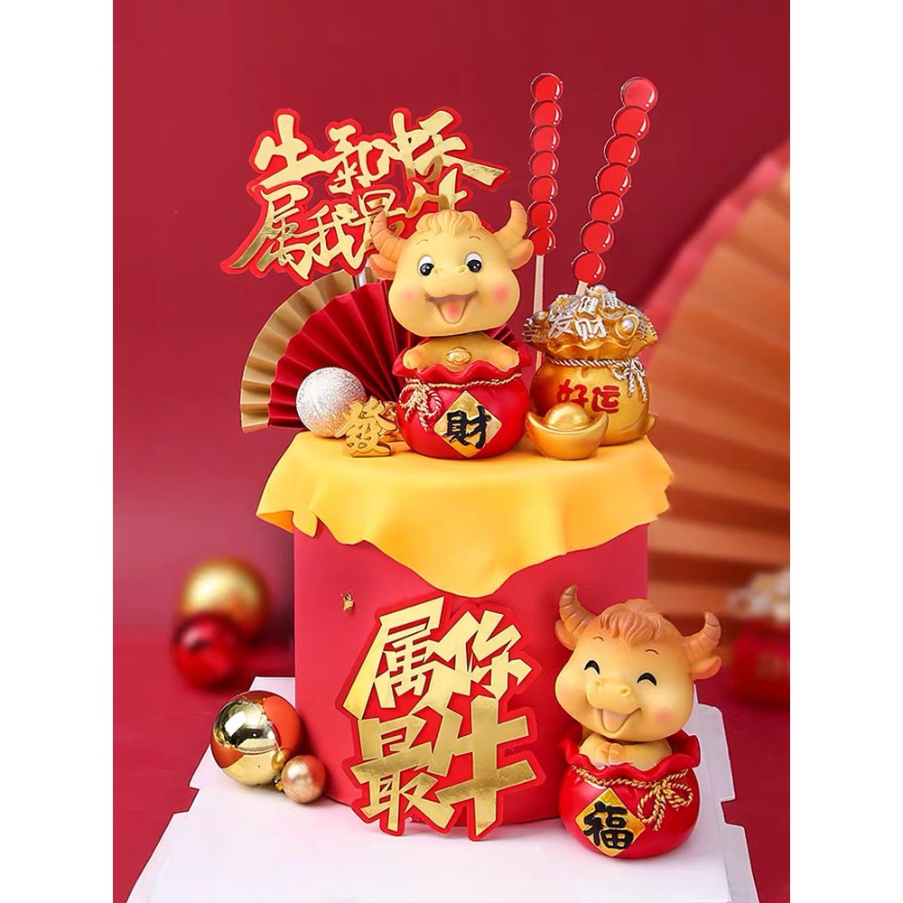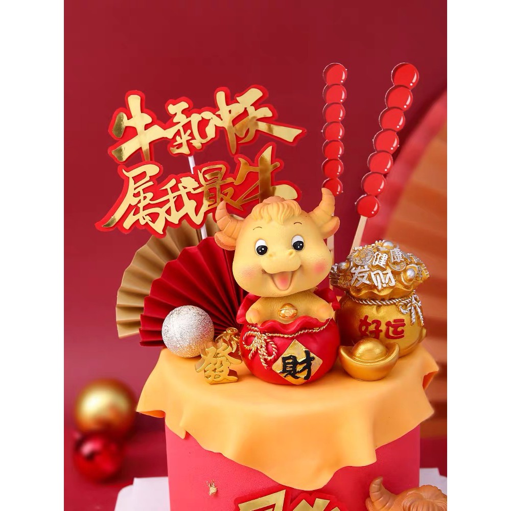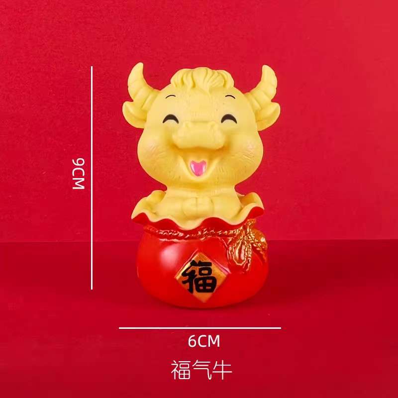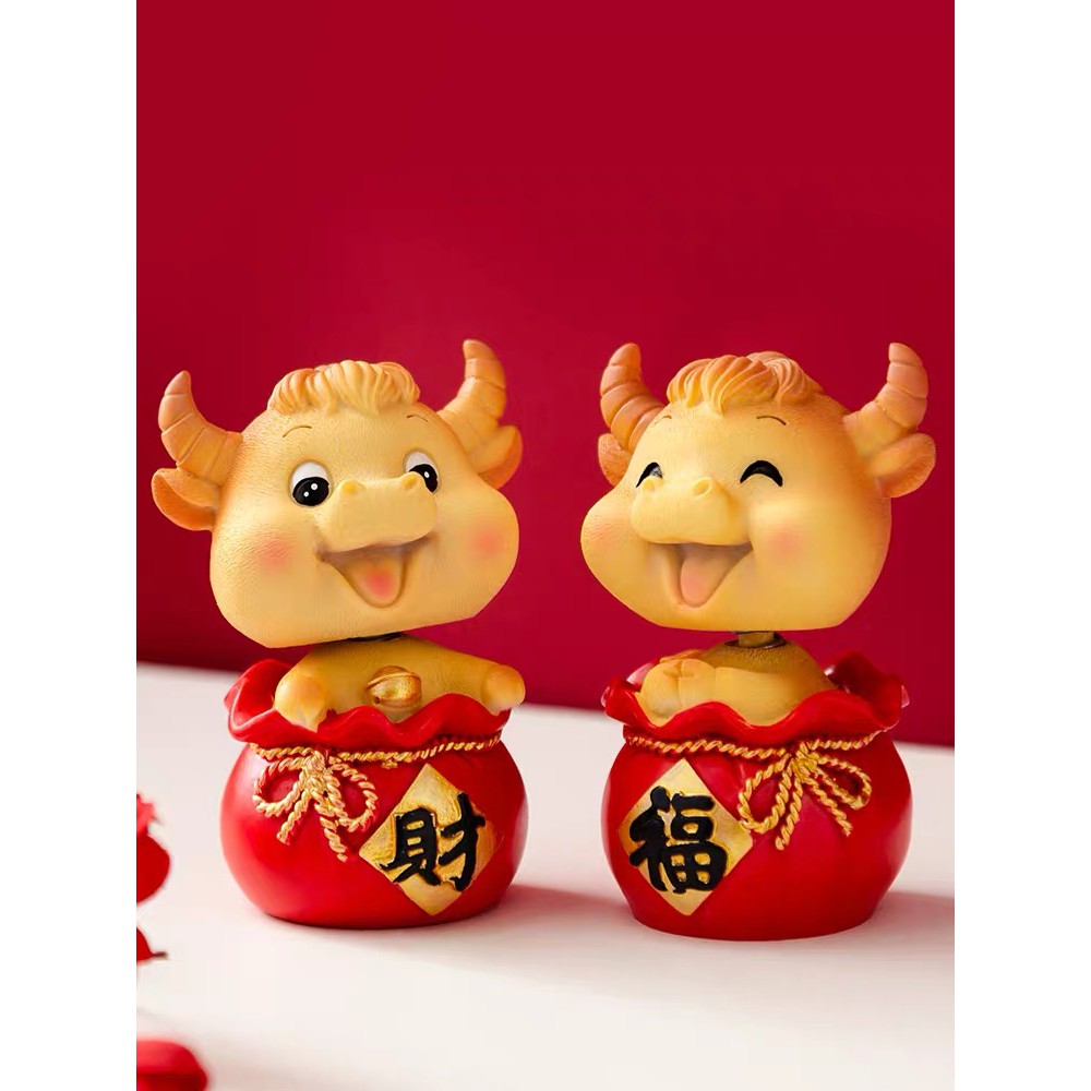 Trang trí cặp đôi trâu vàng ngồi túi đỏ (nhựa)