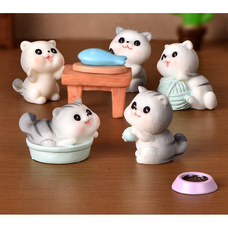 🔸 Kích thước: Mèo 3*4cm, bát thức ăn 0.5*2 cm, ghế 2.5*3.5 cm, đĩa cá 0.3*2.8 cm, cá 0.8*2.5 cm