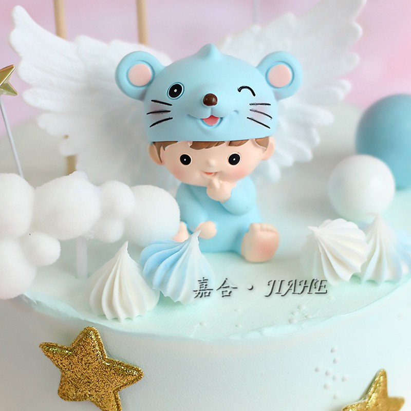 Trang trí em bé đội mũ chuột xanh