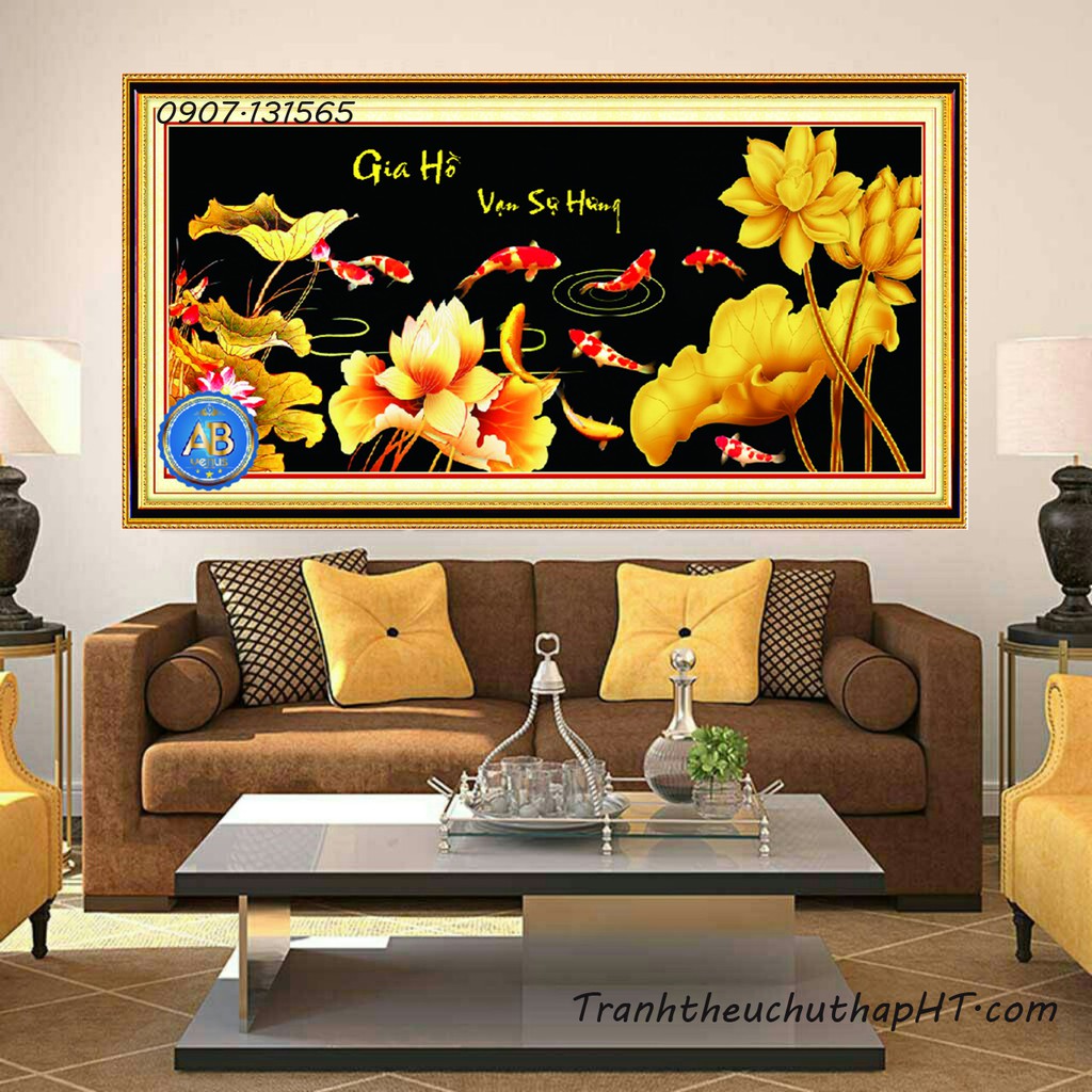 Tranh đính đá 9 cá sen vàng VS118 – Tự đínhÝ nghĩa: cá chép tượng trưng cho sự thịnh vượng, có dư. 9 cá tụ lại có ý nghĩa tụ tài, Gia đình hòa thuận, vạn sự hưng thịnh.