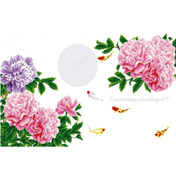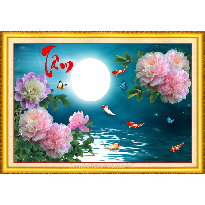 Mẫu này rất đẹp, đính đá các chi tiết cá, hoa mẫu đơn và mặt trăng… (như hình đính kèm) trên nền vải 3D in sắc nét, rõ đẹp, màu sắc tươi sáng, sang trọng