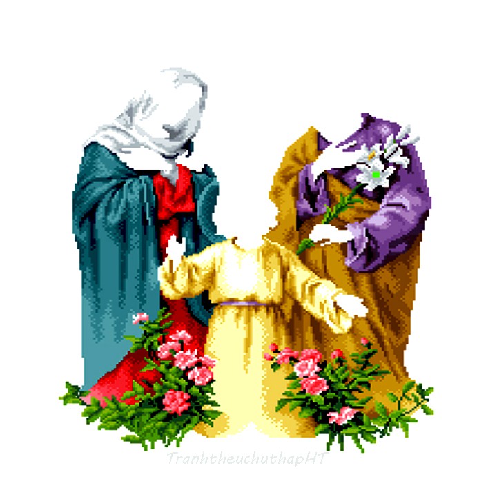 Mẫu này rất đẹp, đính toàn bộ khăn áo nhân vật và hoa (như hình đính kèm) trên nền vải 3D in sẵn gương mặt được in 3D sắc nét, rõ đẹp, màu sắc tươi sáng, sang trọng