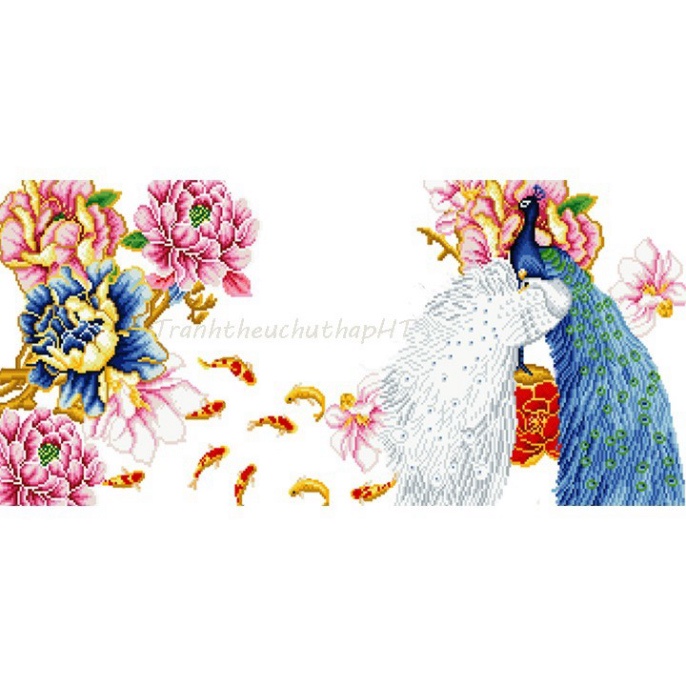 Mẫu này rất đẹp, thêu chim công, cá, và hoa mẫu đơn trên nền vải 3D in sắc nét, rõ, đẹp, màu sắc tươi sáng, sang trọng (phần thêm như hình đính kèm).