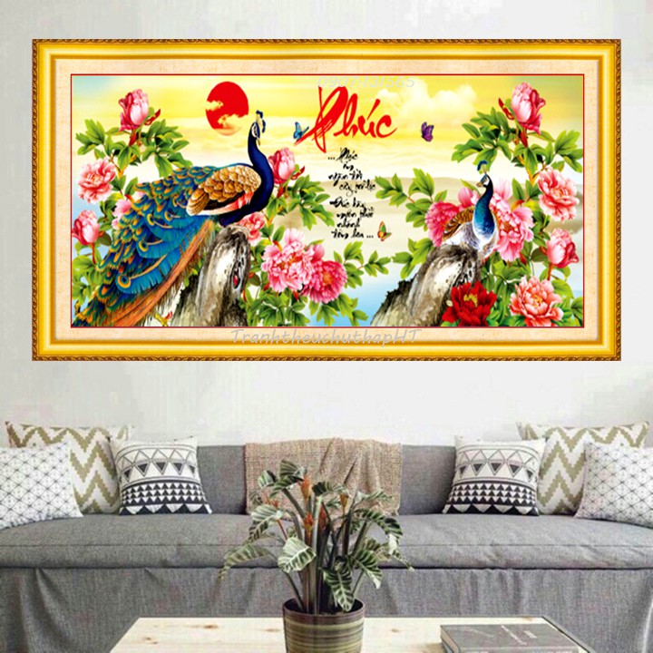 Sở thích & Sưu tầm > Dụng Cụ May Vá || Tranh đính đá - Tranh thêu chữ thập chữ phúc chim công hoa mẫu đơn - size: 108*50cm – tự thêuCòn hàng