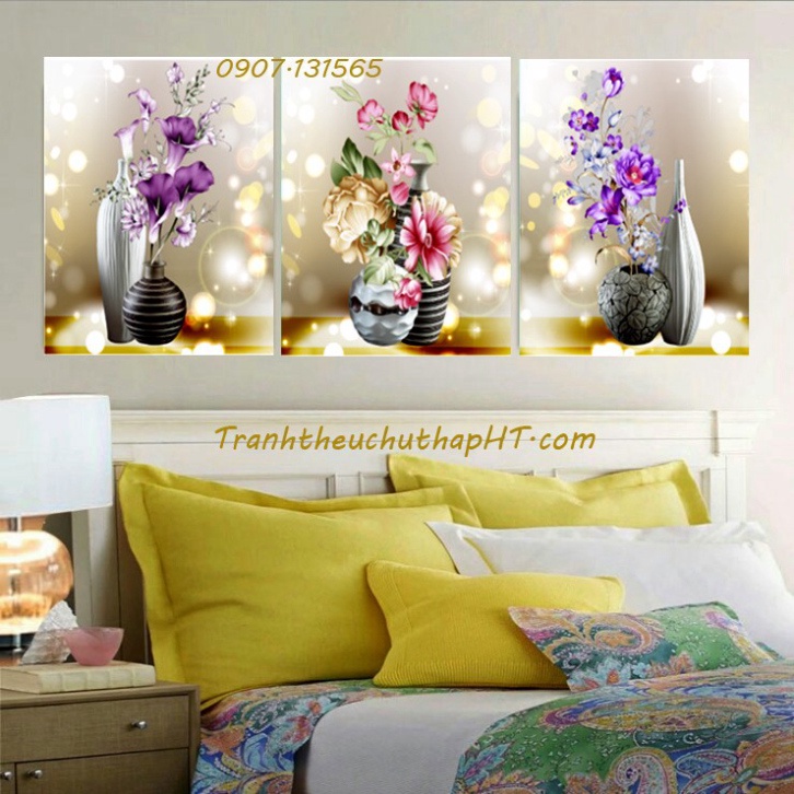 Tranh thêu chữ thập 3 bình hoa nghệ thuật LV3138 (tự thêu)Mẫu này rất đẹp, kiểu tranh bộ hiện đại, thêu các chi tiết trên nền vải 3D, màu sắc trang nhã, sang trọng.