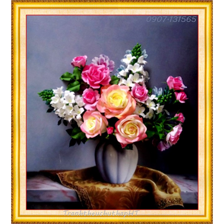 Mẫu này rất đẹp, thêu toàn bộ bình hoa và khăn trải bàn trên nền vải 3D in sẵn (phần thêu như hình đính kèm), màu sắc tươi sáng, sang trọng.