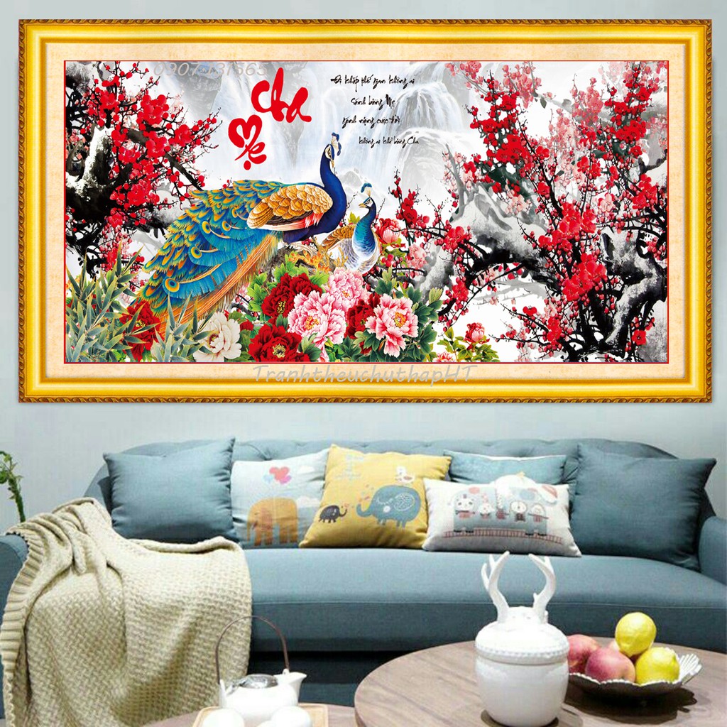 Mẫu này rất đẹp, thêu chim công, cây lá và hoa mẫu đơn trên nền vải 3D in sắc nét, rõ, đẹp, màu sắc tươi sáng, sang trọng (phần thêm như hình đính kèm).
