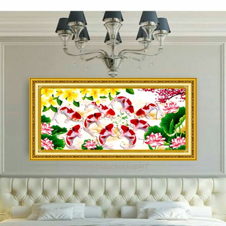 Tranh thêu chữ thập Cửu ngư quần hội LV3275 - tự thêuÝ nghĩa: Tranh thêu chữ thập cửu ngư quần hội, tranh phong thủy, cá tượng trưng cho dư giả, cửu ngư quần hội – tiền tài tụ. Tranh cá làm cho không gian sống trở nên sáng đẹp sang trọng, quý phải, sung túc, ấm no..