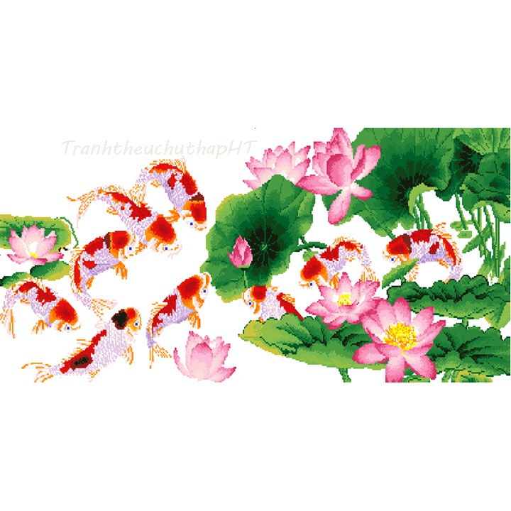 Mẫu này rất đẹp, thêu toàn bộ cá và hoa sen… thêu các chi tiết trên nền vải 3D in sắc nét, rõ, đẹp (phần thêu như hình đính kèm), màu sắc tươi sáng, sang trọng.
