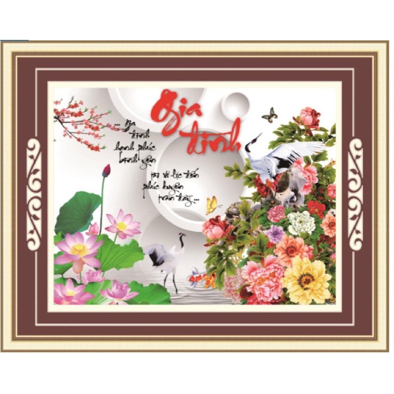 Tranh 3D thêu chữ gia đình, sen, mẫu đơn