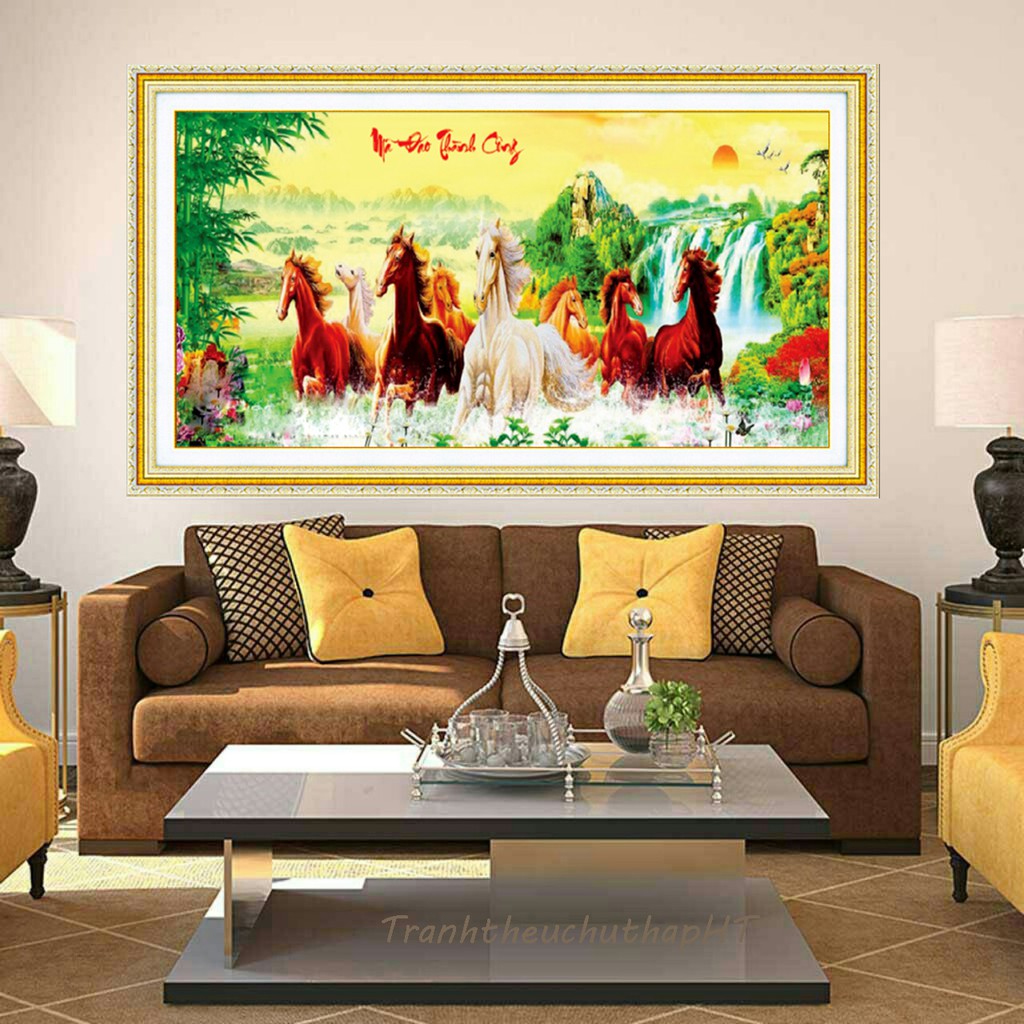 Tranh thêu chữ thập Mã đáo thành công 127*63cm - tự thêuÝ nghĩa: Tranh đính đá mã đáo thành công, tranh phong thủy, mã đáo thành công, mang lại sự thuận lợi, thịnh vượng, thành công. Treo ngựa không chạy ra ngoài cửa nên mẫu này rất dễ treo, treo 2 bên tường nhà đều được (không treo trực diện hướng ra cửa chính).